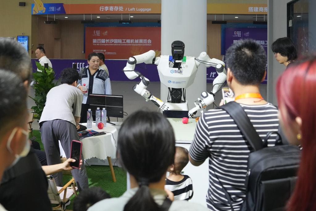 5月15日,观众在第四届长沙国际工程机械展览会现场观看人形机器人演示。新华社记者薛宇舸 摄