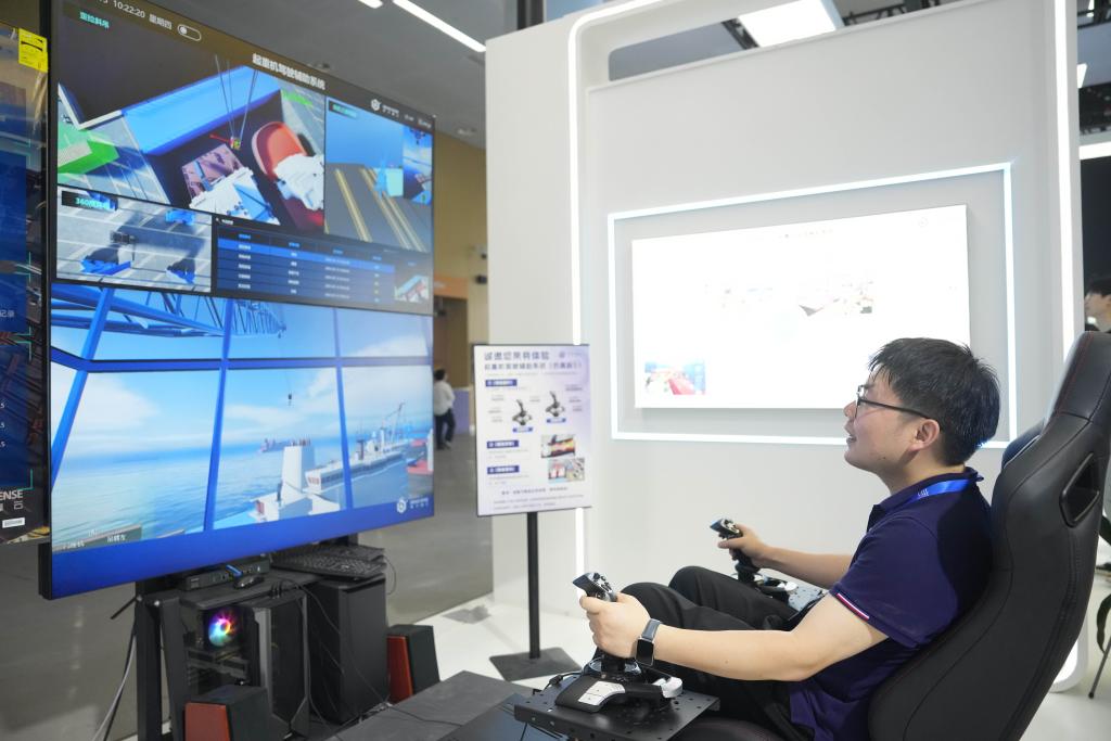 5月15日,参展商在第四届长沙国际工程机械展览会现场演示起重机驾驶辅助系统。新华社记者薛宇舸 摄