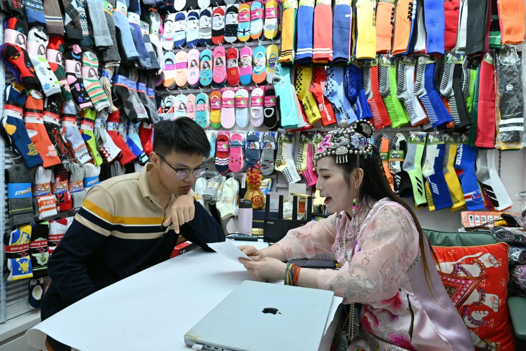 5月15日,义乌国际商贸城经营户傅江燕(左)在商位与来自秘鲁的客商卡德纳斯用西班牙语交流。