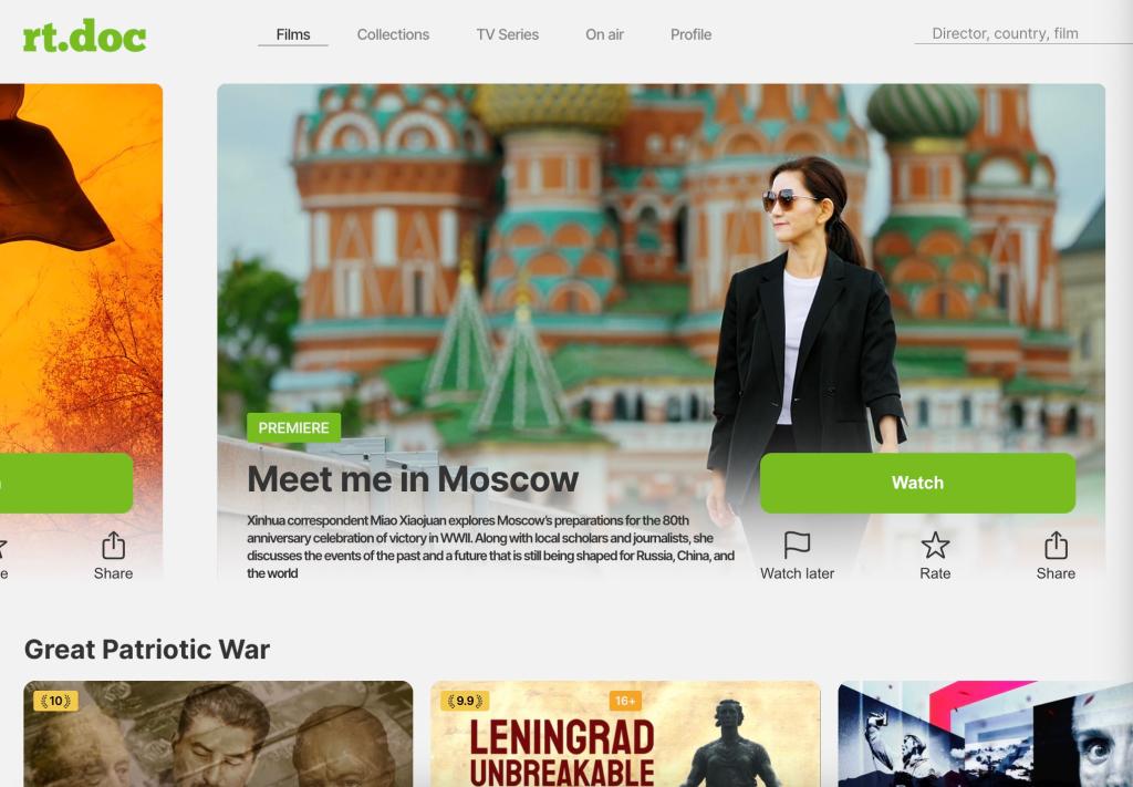 “今日俄罗斯”电视台纪录片频道首页大图推介纪录片,并将其标注为“首映”。