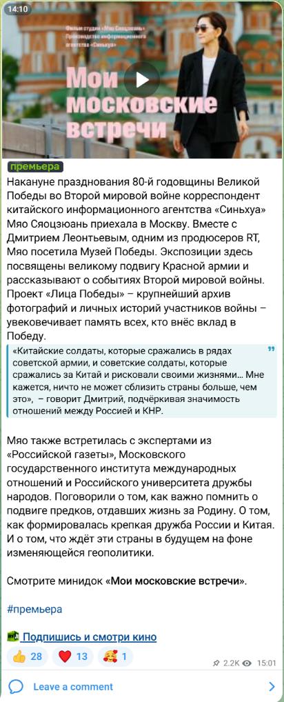 “今日俄罗斯”电视台在社交媒体Telegram平台推介纪录片俄文版。