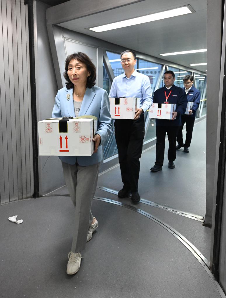 5月18日,护送文物归国的工作人员手捧装载着子弹库帛书的保护箱走出客机。新华社记者 李贺 摄