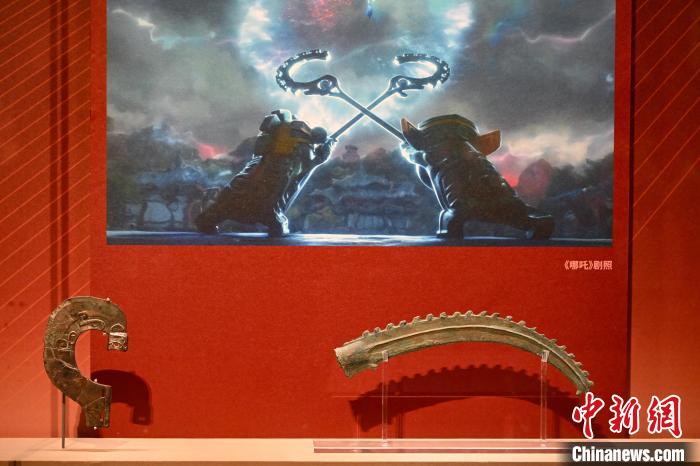 3500多年后,殷商文化在展厅动了起来。电子屏幕上,甲骨文字中的“鼎”“磬”“舞”通过动画逐步演变成今天的汉字;司马迁、妇好、商纣王等历史人物有了卡通形象,与观众跨时空“对话”;电影《哪吒2》的“彩蛋区”,观众能在展柜里找到影片中用到的乐器、酒具,以及多个和片中武器相似的元素,与一旁播放的电影片段“找不同”。