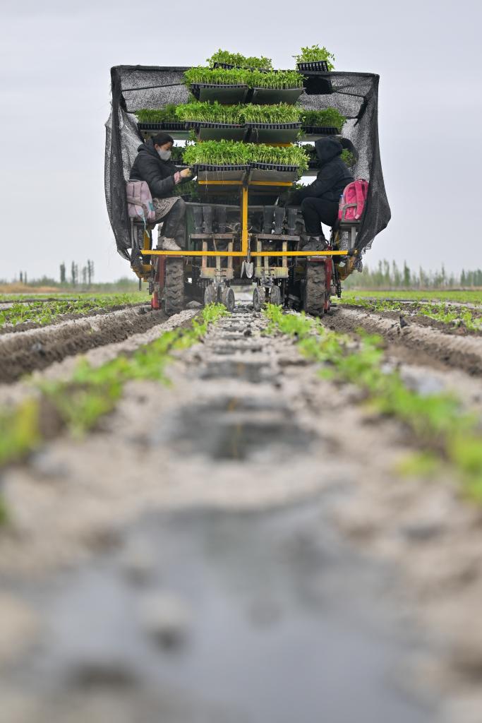 4月26日,在新疆焉耆回族自治县四十里城子镇,农户在自动移栽机上投放番茄苗。新华社记者丁磊 摄