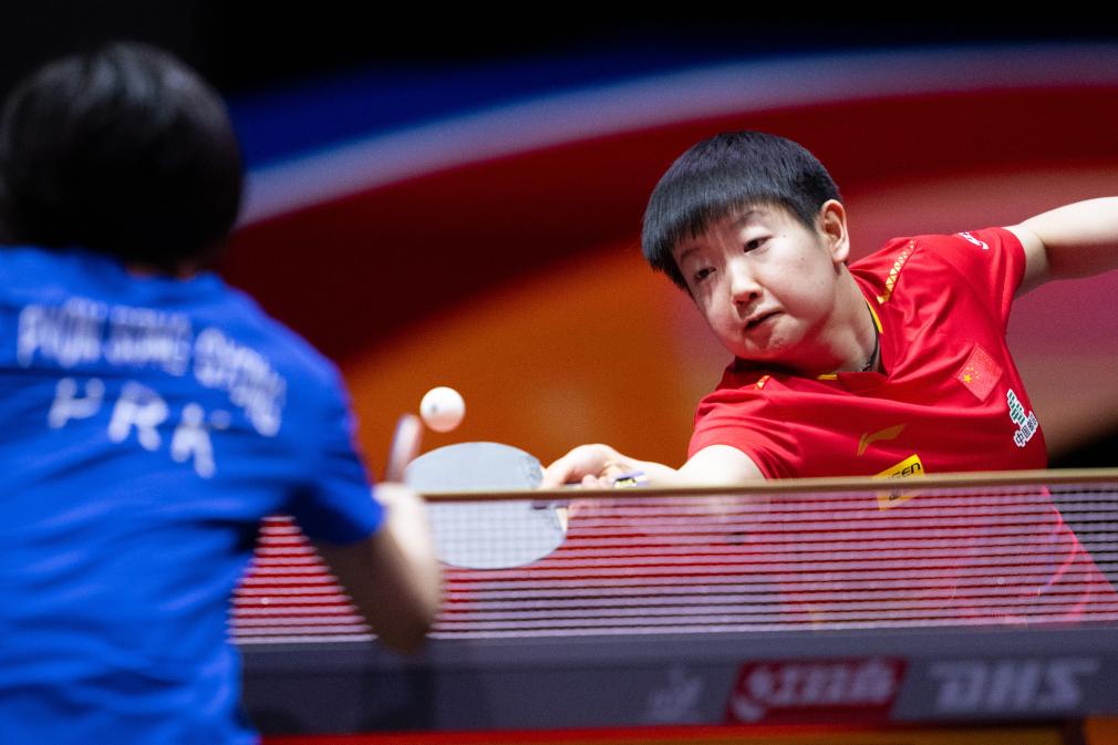 5月19日,孙颖莎在比赛中回球。新华社记者 肖艺九 摄