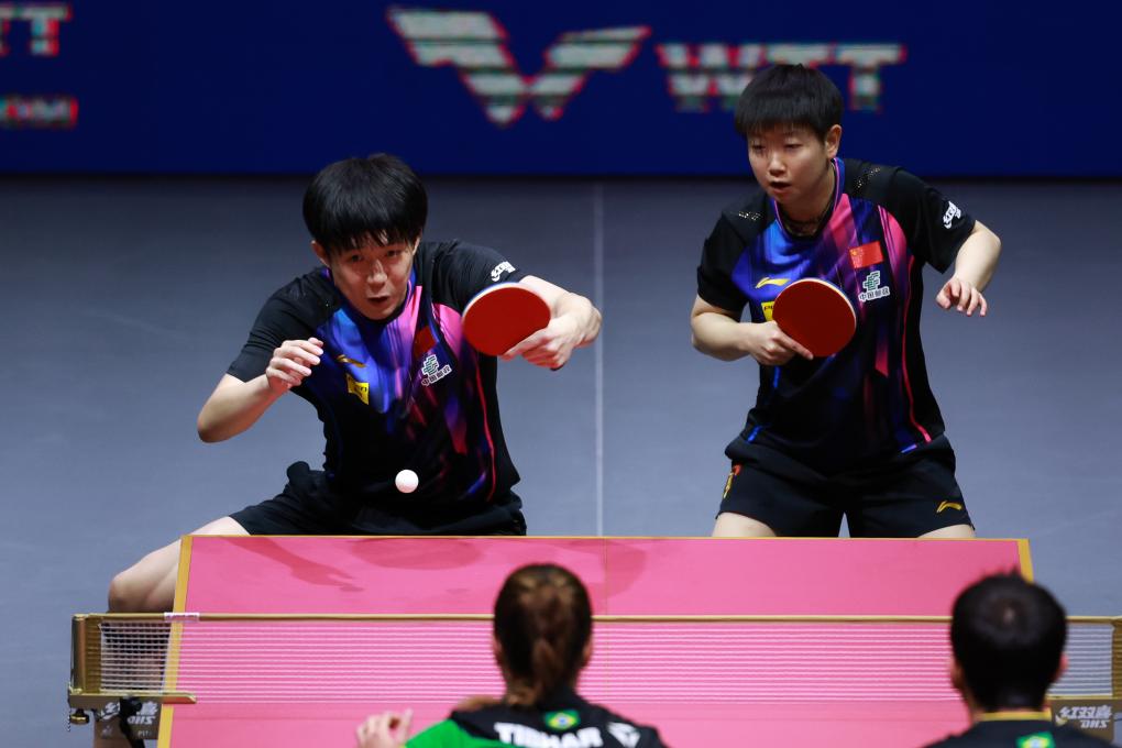 5月19日,王楚钦/孙颖莎(左)在比赛中。新华社记者 肖艺九 摄