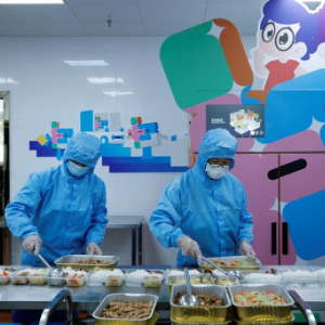 广州市黄埔区开元学校的智慧食堂里,工作人员正在分装“数字大厨”做好的饭菜。新华社发