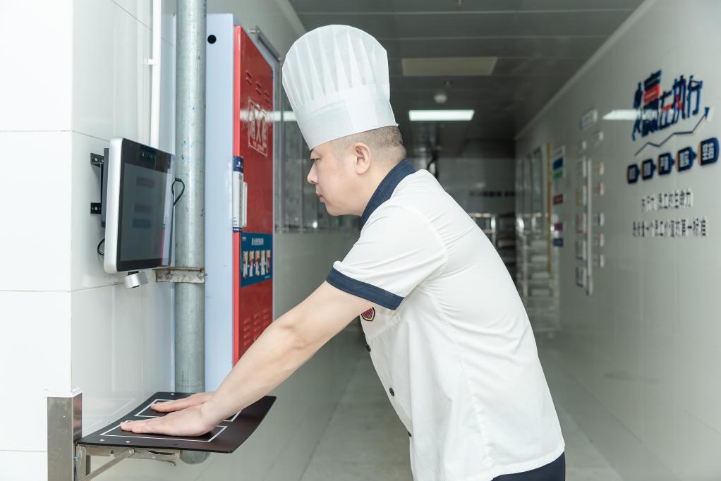 成都新川外国语学校的后厨,厨师进门前得先过安检系统,体温、健康状态一键扫描,智能识别仪容仪表和手部异常,比如未戴工作帽、体温过高、手指涂指甲油等都不会通过检测。