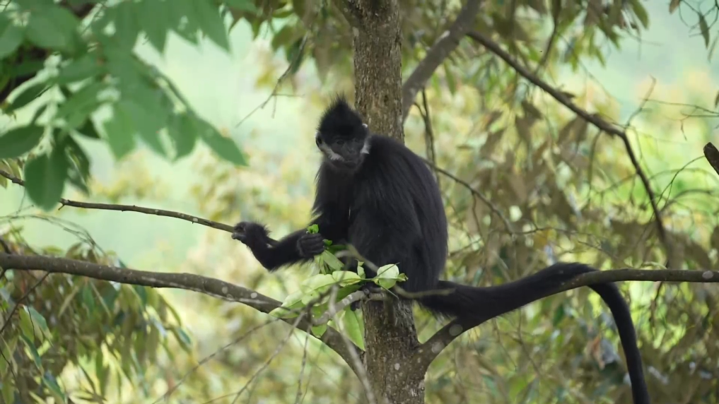 贵州麻阳河国家级自然保护区是黑叶猴的重要栖息地,有“黑叶猴王国”的美誉。近日,记者在保护区内拍摄到国家一级保护动物黑叶猴觅食的珍贵画面。