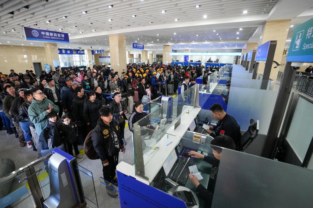 蒙古国游客在二连浩特口岸等待入境。新华社发