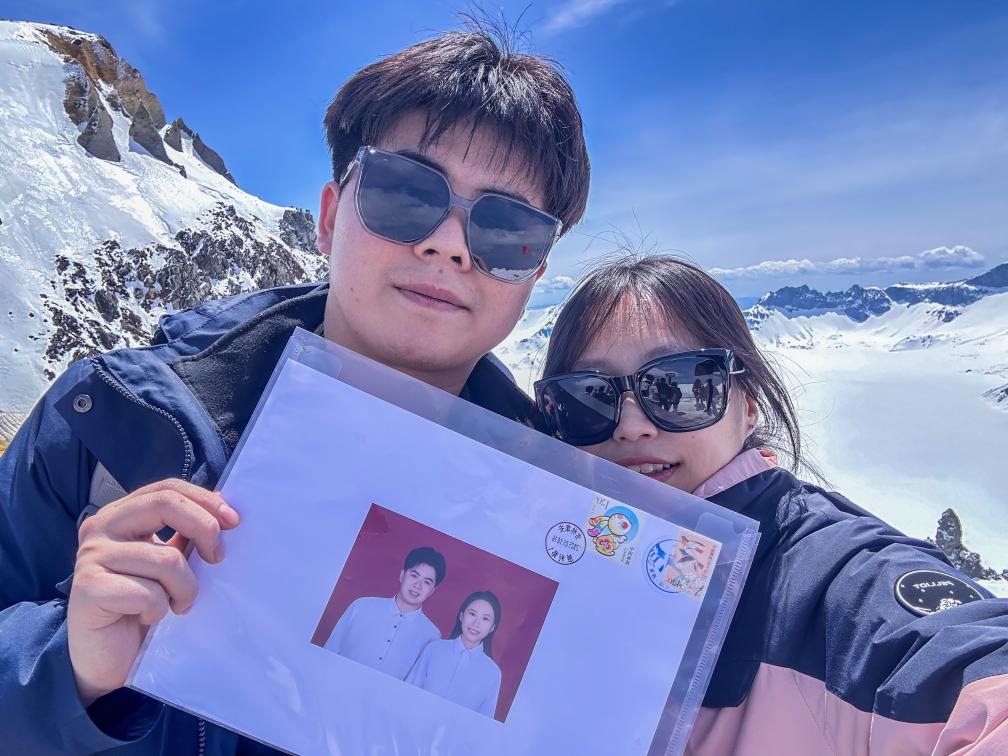 正在“结婚旅行”的梁森(左)和王铭忆在长白山合影。(受访者供图)