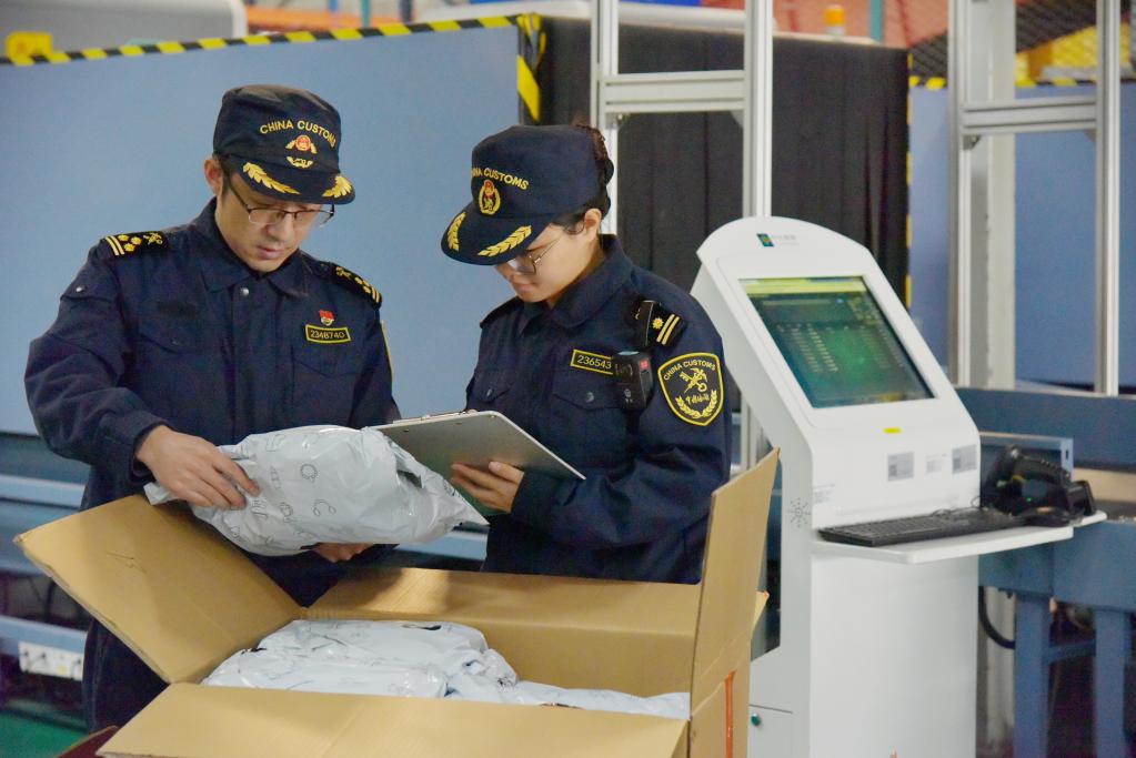 无锡海关关员对运往墨西哥的跨境电商商品进行查验(2024年12月26日摄)。新华社发