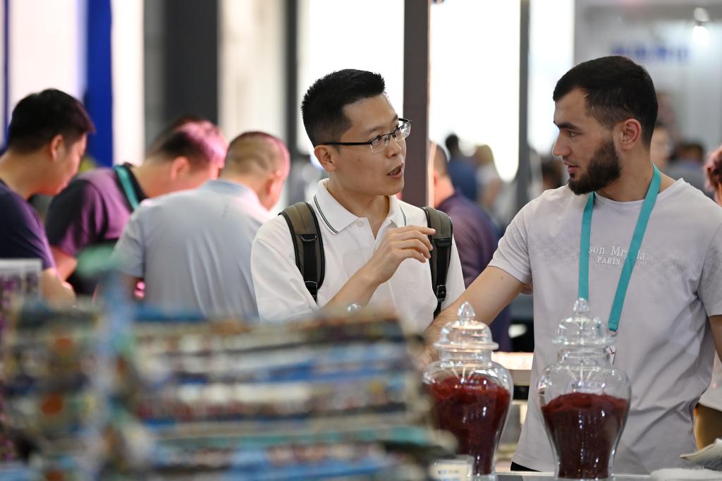 5月21日,在第九届丝绸之路国际博览会暨中国东西部合作与投资贸易洽谈会丝路优品展上,参观者与参展商交流。新华社记者 李一博 摄