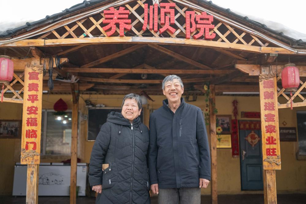 在伊春市友好区,伊春森工上甘岭林业局有限责任公司溪水林场分公司退休职工刘养顺(右)和妻子杨秋娥在自家农家院留影(2024年3月13日摄)。新华社记者 谢剑飞 摄
