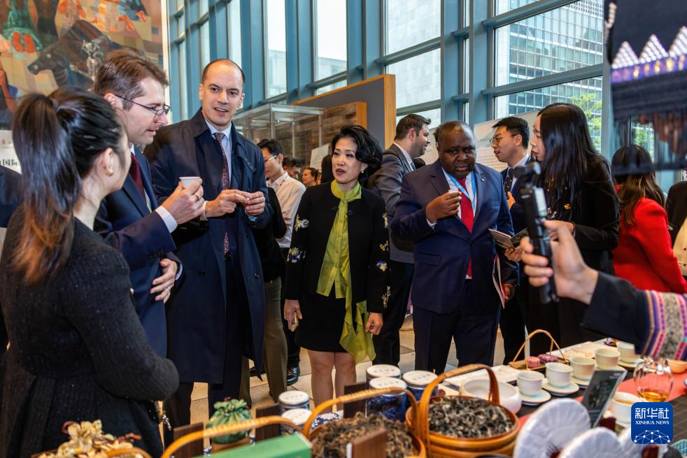 5月21日,在位于纽约的联合国总部,来宾参加“第三届老山国际春茶节之走进联合国”国际茶日庆祝活动。新华社发(周焕新摄)
