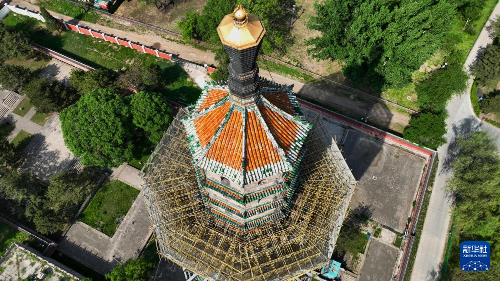 这是5月20日拍摄的承德避暑山庄舍利塔修缮施工现场(无人机照片)。