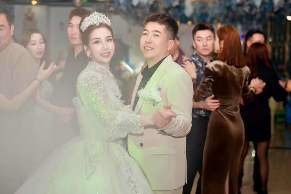 买迪娜和别格扎提在婚礼上跳舞。(受访者供图)