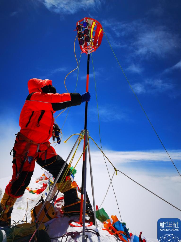 2020年5月27日,2020珠峰高程测量登山队队员在珠峰峰顶开展测量工作。新华社特约记者 扎西次仁 摄