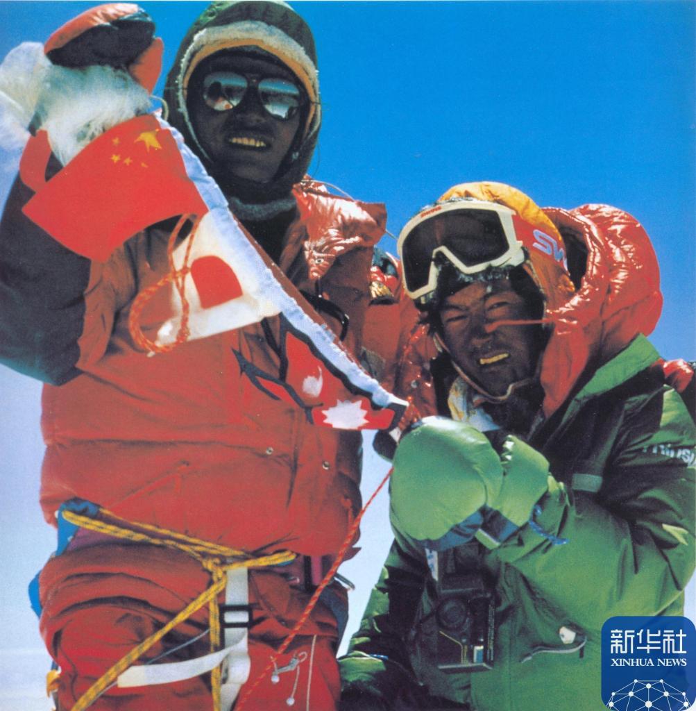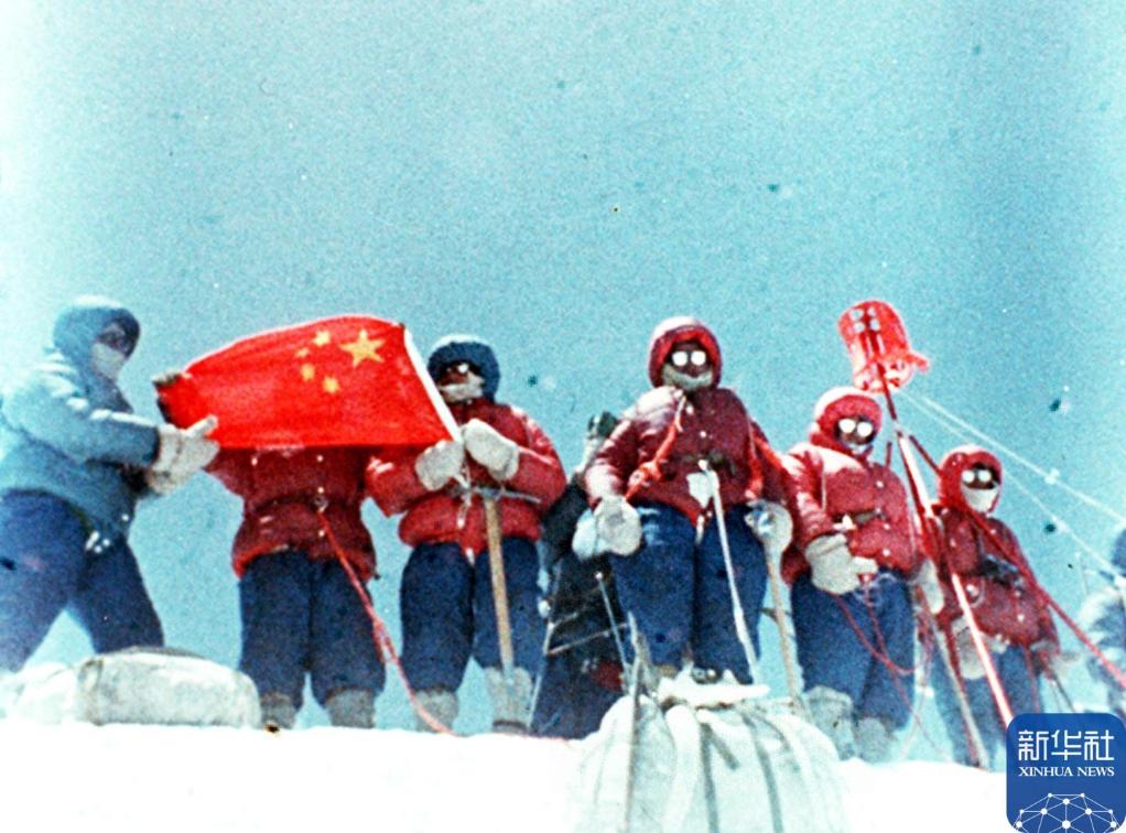 1975年5月27日,中国登山运动员索南罗布、罗则、侯生福、桑珠、大平措、贡嘎巴桑、次仁多吉、阿布饮、潘多从北坡登上珠峰。新华社发(侯生福 摄)