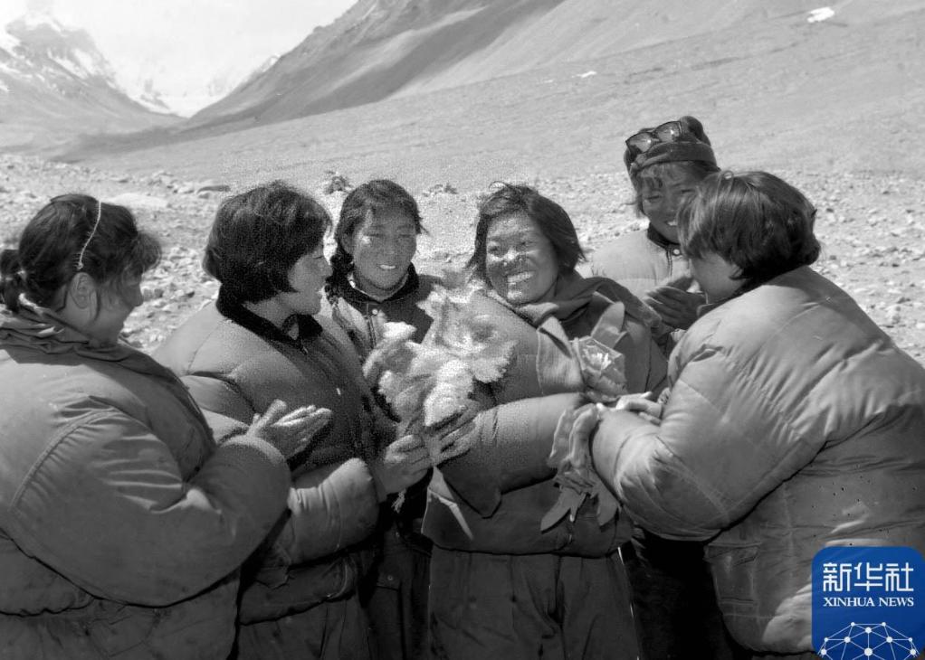 1975年5月,潘多(左四)成功登顶珠峰后,从珠峰返抵大本营。新华社发