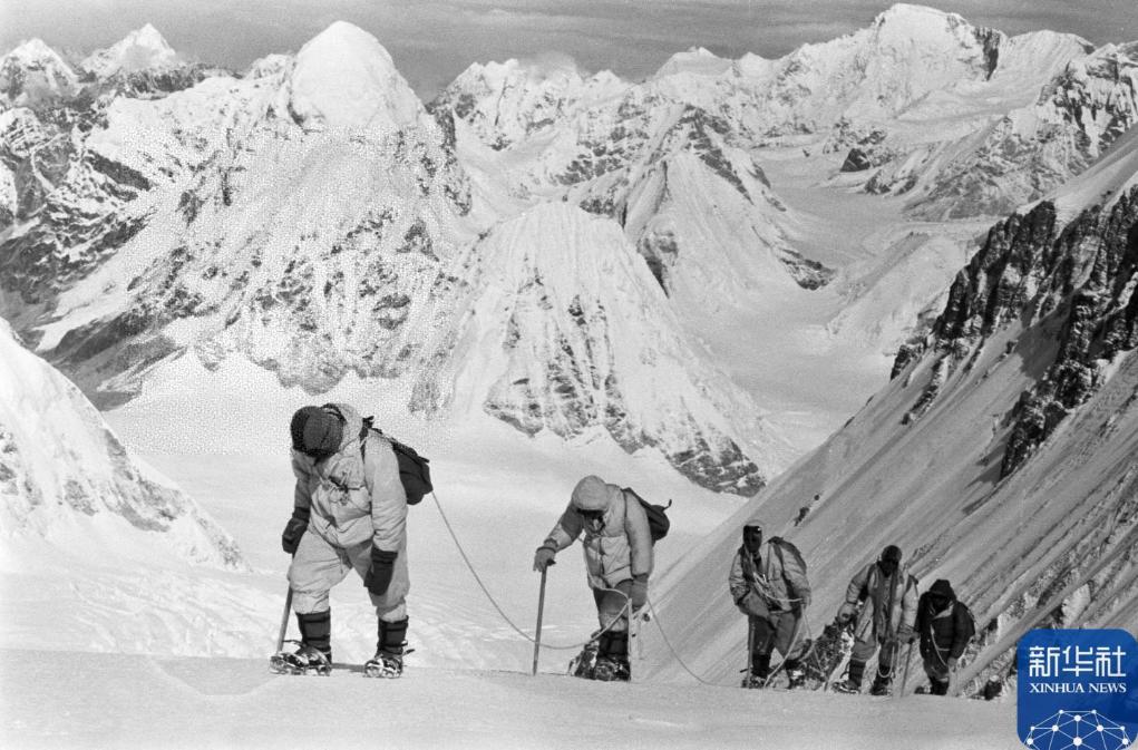 1960年5月,中国登山队队员在海拔7150米的冰雪坡上行进。新华社发(曾曙生 摄)