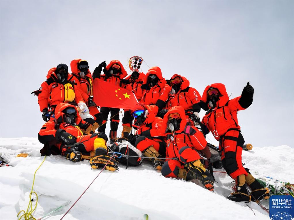 2020年5月27日,2020珠峰高程测量登山队队员在峰顶合影留念。新华社特约记者 扎西次仁 摄