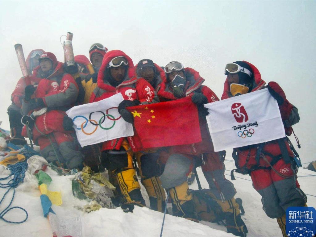 2008年5月8日,北京奥运圣火珠峰传递登山队成功登顶珠峰,中国登山队员在峰顶展示中国国旗、奥运五环旗和北京奥运会会徽旗。新华社特约记者 罗布占堆 摄