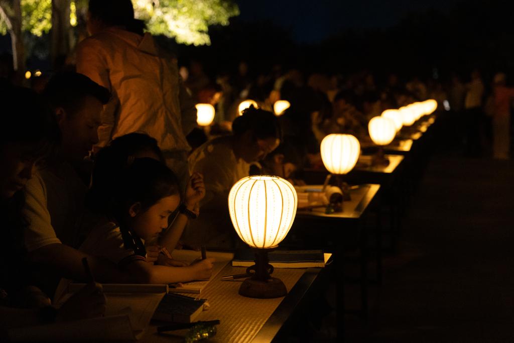 廊檐下,《岳阳楼记》在纱幕投影上逐句浮现,人们随性吟诵诗句。伴随舒缓的音乐,游人在演员的指引下入席就坐,或翻阅桌上摆放的《范文正公文集》,或提笔写下心中感慨。