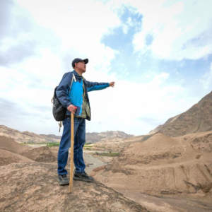 5月13日,李世翔在黄河黑山峡考察途中,站在一处秦兵营遗址上遥指对面山上的长城。