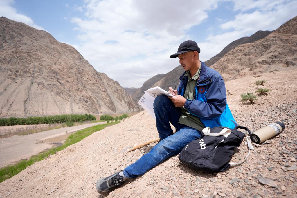 5月13日,李世翔在黄河黑山峡考察途中完善绘制的图纸信息。