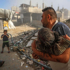 5月21日,在以军空袭加沙地带北部杰巴利耶难民营所在区域后,一名男子抱着受伤的儿童寻求救援。新华社发(马哈茂德·扎基摄)