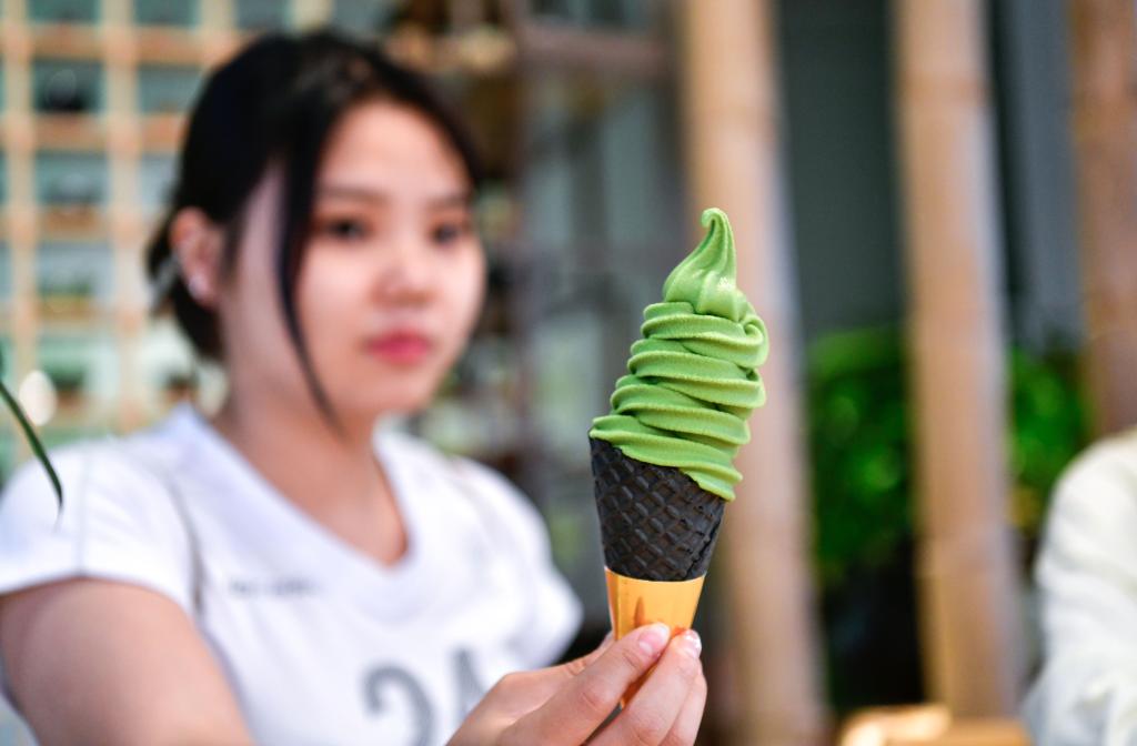 5月15日,在江口县一家抹茶产品体验店,顾客展示抹茶冰淇淋。新华社记者 杨文斌 摄