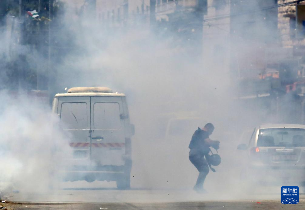 5月20日,在约旦河西岸城市纳布卢斯郊区的阿斯卡尔难民营附近,以方人员在行动中释放催泪瓦斯。新华社发(尼达尔·艾仕塔耶摄)