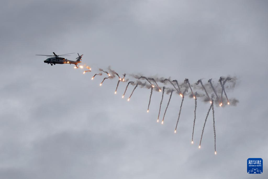 5月26日,中柬“金龙-2025”联演海空方向实兵演练在柬埔寨西哈努克港附近海空域举行,参演直升机发射热诱弹。新华社发(甘俊 摄)