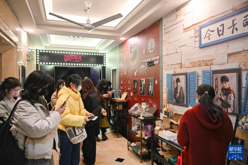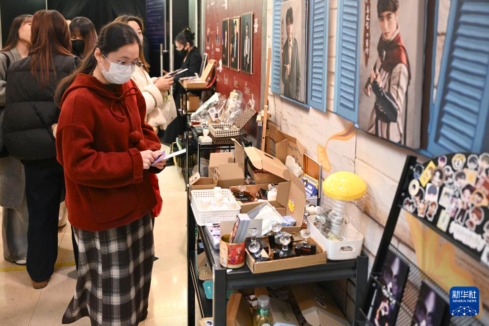 在上海亚洲大厦,观众浏览摆放于“星空间”剧场门口的演出周边产品(2025年1月5日摄)。新华社发(陈浩明摄)