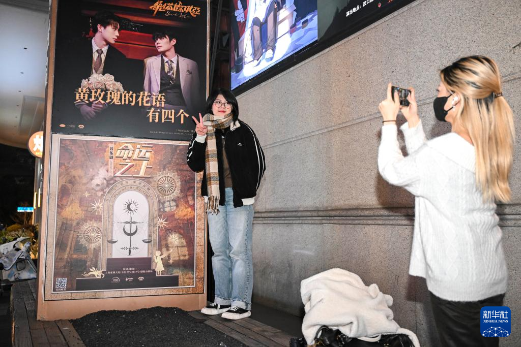 两位来自浙江宁波的观众在位于上海亚洲大厦的“星空间”剧场外拍照(2025年1月5日摄)。新华社发(陈浩明摄)