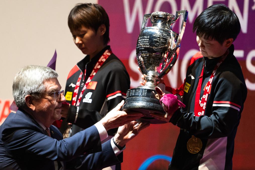 国际奥委会主席巴赫(左)在颁奖仪式上向冠军中国选手孙颖莎(右)颁发奖杯。新华社记者 肖艺九 摄