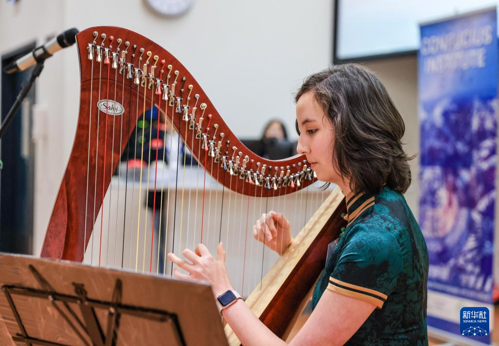 5月24日,在新西兰惠灵顿维多利亚大学举行的“汉语桥”中文比赛上,一名参赛选手演奏乐器。新华社发(孟韬摄)