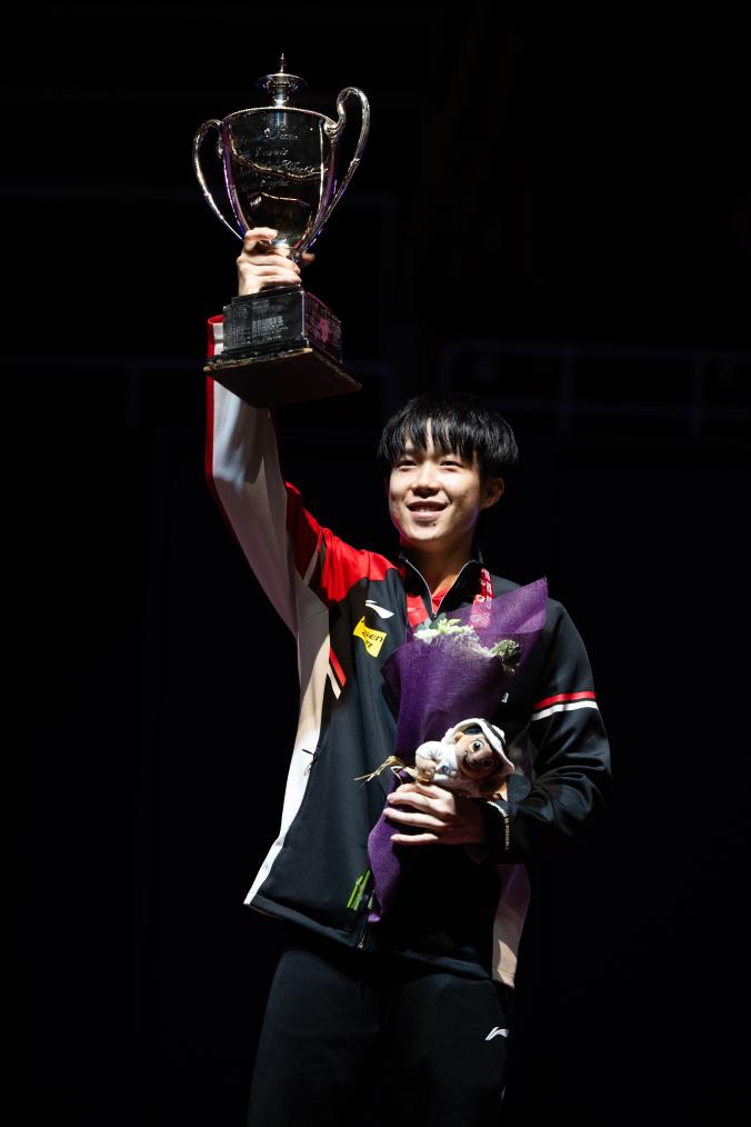 冠军中国选手王楚钦在颁奖仪式上高举奖杯。新华社记者 肖艺九 摄