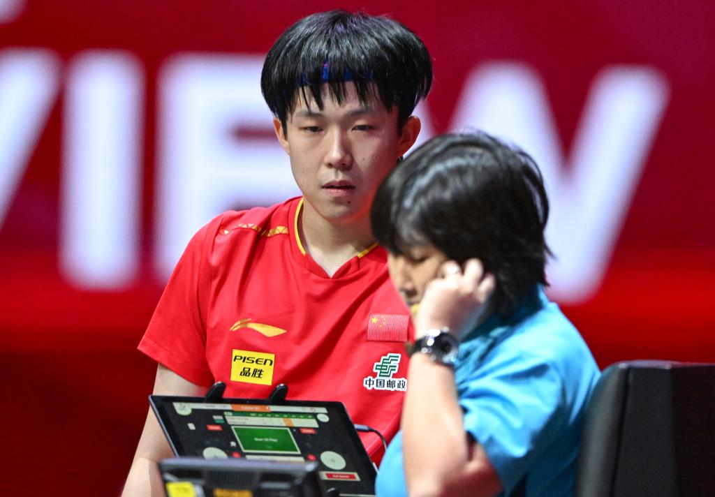 5月20日,王楚钦(左)在比赛中向裁判申请鹰眼挑战。新华社记者 贺长山 摄