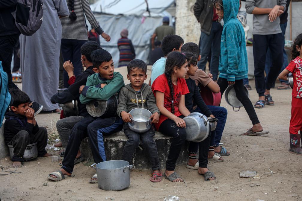 5月2日,孩子们在加沙城等待领取救助食物。新华社发(里泽克·阿卜杜勒贾瓦德摄)