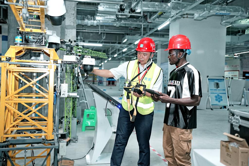 工作人员给外国观摩嘉宾介绍“群塔智控系统”。新华社发