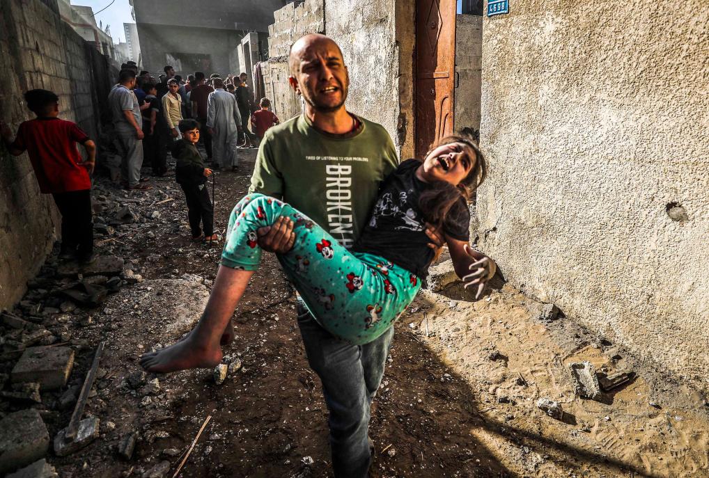 5月21日,在以军空袭加沙地带北部杰巴利耶难民营所在区域后,一名男子抱着受伤的女孩寻求救援。新华社发(马哈茂德·扎基摄)
