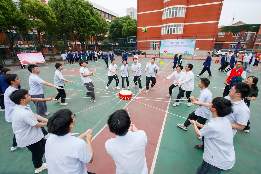 2025年5月22日,江苏省海安市实验中学高三学生在体验“同心击鼓”游戏。高考临近,各地学校组织高三学生开展不同形式的减压活动,帮助学生放松心情,迎接高考。新华社发(顾彬斌 摄)