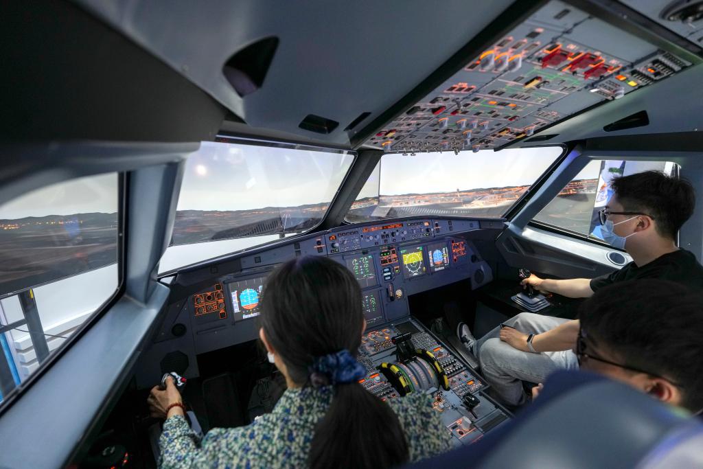 在第三届民航科教创新成果展的中国南方航空公司展区,参观者在体验南航自主研制的空客A320飞行与导航程序训练器(FNPT)。新华社记者 鞠焕宗 摄