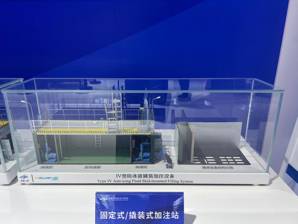 在第三届民航科教创新成果展上,中国民用航空总局第二研究所展示的IV型防冰液撬装加注设备模型。(民航二所六维公司供图)