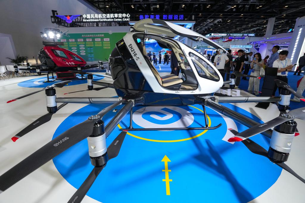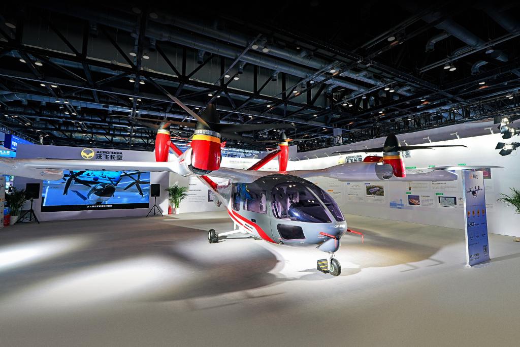 在第三届民航科教创新成果展的沃飞长空公司展区,正在展出的AE200 eVTOL飞行器。(沃飞长空供图)