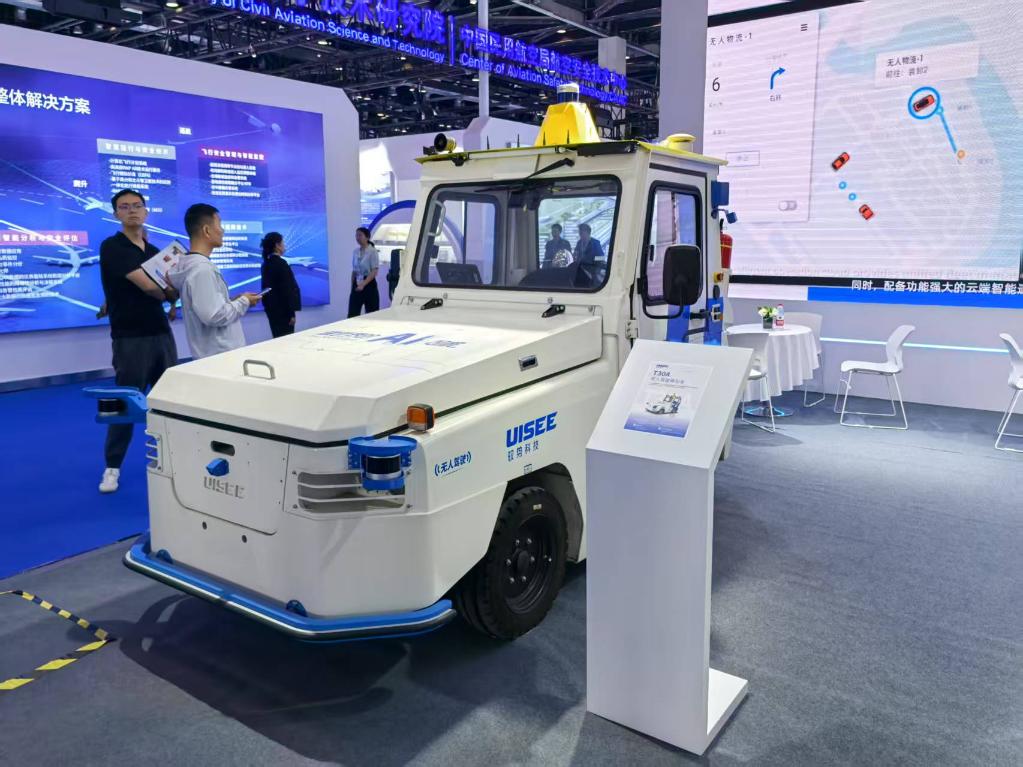 在第三届民航科教创新成果展的驭势科技展区展示的T30A无人驾驶牵引车。新华社记者 叶昊鸣 摄