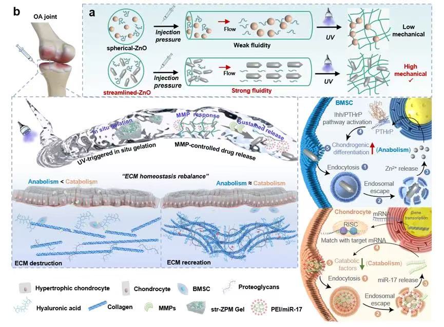 李楠介绍,该研究聚焦于骨关节炎治疗中细胞外基质稳态失调这一关键问题,设计了一种具有基质金属蛋白酶响应特性的流线型氧化锌可注射水凝胶,并搭载miR-17-5p基因药物,实现细胞外基质稳态的双向调控。