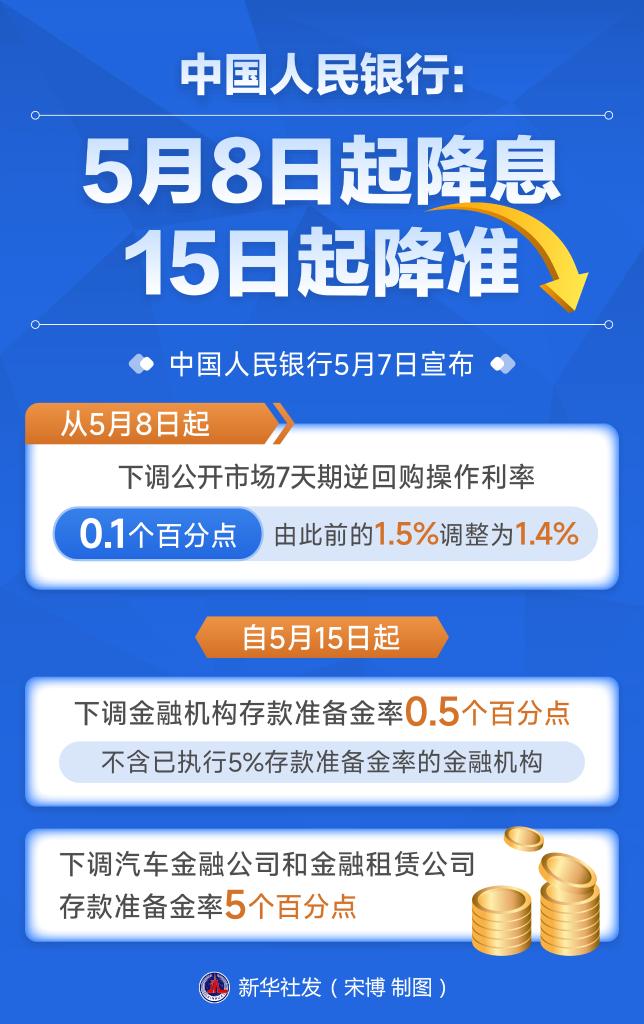 早在国新办5月7日举行的新闻发布会上,中国人民银行、金融监管总局、中国证监会三部门负责人宣布一揽子重磅金融政策,其中就包括,将下调政策利率0.1个百分点、下调结构性货币政策工具利率0.25个百分点。